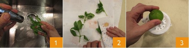Para preparar los paquetitos de pasta filo con corazón de salmón y queso, comenzad por realizar la salsa de acompañamiento. Lavad delicadamente las hojas de albahaca bajo el agua corriente 1, secadlas con un papel de cocina, tamponándolas ligeramente 2 y colocadlas en un cuenco. Exprimid y filtrad el jugo de la lima 3,