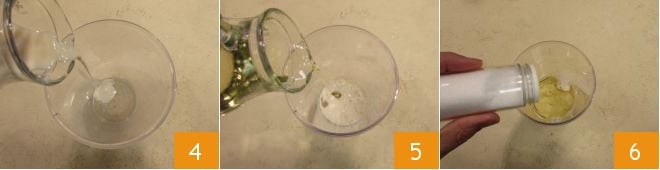 luego vertedlo en el vaso de una batidora junto con la leche de soja 4, el aceite de semillas 5 y una pizca de sal 6.