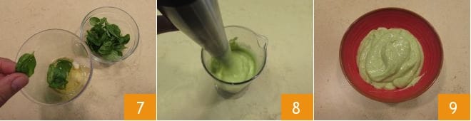 Por último, añadid las hojas de albahaca 7 y batid todo con una batidora de mano 8 hasta obtener una mayonesa cremosa. Transferid la mezcla a un cuenco 9 y guardadla en el frigorífico hasta su uso.