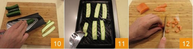 Lavad los calabacines, cortad los extremos y cortadlos en rodajas de aproximadamente 1 mm de grosor, ayudándoos con una mandolina 10. Colocadlas en una parrilla caliente, asadlas por ambos lados 11 y reservadlas. Mientras tanto, cortad en cubos el salmón ahumado 12.