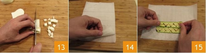Por último, cortad también la scamorza blanca en dados 13 y comenzad a componer vuestros paquetitos. Tomad una hoja de pasta filo a la vez, dejando las demás aparte, siempre envueltas en película transparente, ya que tienden a secarse rápidamente. Dividid vuestra hoja de 35x50 cm por la mitad para obtener dos rectángulos de 35x25 cm. Superponed las dos mitades 14 y rellenadlas disponiendo primero los calabacines 15,