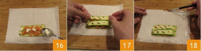 luego los cubitos de salmón ahumado, los dados de scamorza 16, una pizca de pimienta negra y cubrid nuevamente con otras dos rodajas de calabacín 17. Pincelad los bordes de la hoja de pasta con agua 18, para sellarla bien al cerrarla.