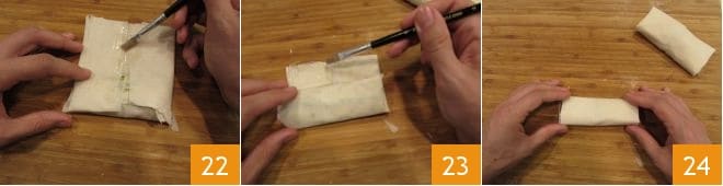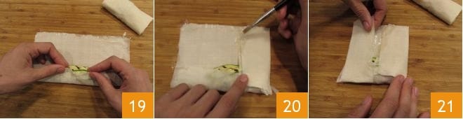 Tomad un borde de la pasta del lado más largo y plegadlo hacia dentro para cubrir el relleno 19; luego plegad una de las dos partes laterales hacia dentro hasta llegar a la mitad de la hoja de pasta filo y pincelad nuevamente con agua 20. Repetid la operación también para el otro lado 21,