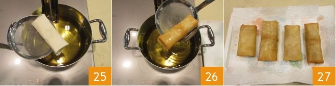 Verted el aceite en una cazuela lo suficientemente grande y llevadlo a una temperatura de 160-170°C como máximo. Luego utilizadlo para freír vuestros paquetitos 25 durante unos 2 minutos, hasta que estén bien dorados. En este punto escurridlos 26 y colocadlos en una bandeja forrada con papel de cocina 27, que absorberá el exceso de aceite. Servid los paquetitos de pasta filo con corazón de salmón y queso aún calientes, acompañándolos con la salsa de albahaca.