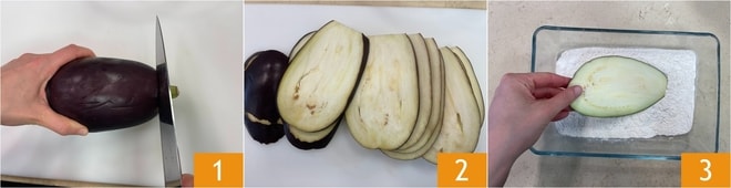 Para preparar la parmigiana de mar, primero comienza con las berenjenas: lávalas y quita el tallo 1, luego córtalas en rodajas finas, de aproximadamente 4-5 mm de grosor 2. Mientras tanto, calienta el aceite de semillas en una olla grande. Enharina las berenjenas 3.