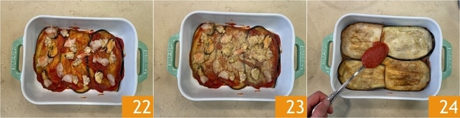 Continúa con una capa de mejillones, almejas y gambas 22, luego espolvorea con el pan rallado con hierbas 23. Continúa con otra capa de berenjenas y salsa 24 y alterna las capas de la misma manera hasta agotar los ingredientes.