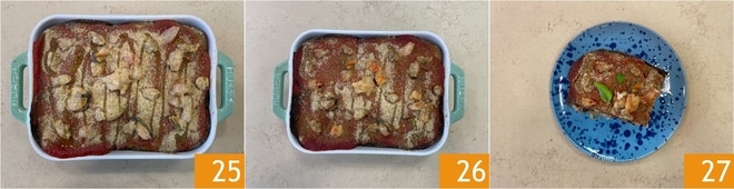 Termina la última capa con el pan rallado y un chorro de aceite de oliva 25. Cocina en horno estático precalentado a 180° durante 25 minutos. Saca tu parmigiana de mar del horno, déjala enfriar ligeramente y sírvela perfumando el plato con hojas de albahaca fresca 27!