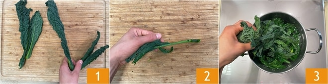 Para preparar la pasta con col rizada negra y castañas, primero encárgate de limpiar la col rizada. Separa las hojas de la col 1 y elimina los tallos desprendiéndolos delicadamente del tallo 2. No tires los tallos: servirán después. Reserva también las hojitas más pequeñas y tiernas. Escalda la col rizada en agua hirviendo salada 3.