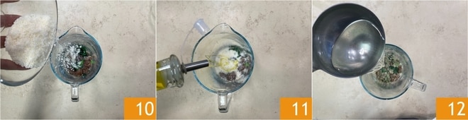 Incorpora también el Parmigiano Reggiano DOP rallado 10, un chorrito de aceite 11 y un poco de agua de cocción de la col 12.