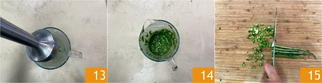 Tritura con una batidora de inmersión 13 hasta obtener una crema lisa 14. Reserva y recupera los tallos de la col rizada. Córtalos en rodajas finas 15.