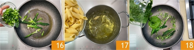 En una sartén, vierte un chorrito de aceite y el medio diente de ajo. Añade los tallos de la col rizada y las hojitas más tiernas reservadas al principio 16. Añade una pizca de sal y termina la cocción. Mientras tanto, cocina los pennones en el agua de cocción de la col que habrás vuelto a llevar a ebullición 17. Tan pronto como la col esté tierna, elimina el ajo y agrega la crema realizada con las hojas 18. Añade también un poco de agua de cocción.