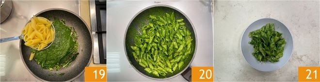Escurre los pennones al dente y transfiérelos directamente a la sartén 19. Saltea todo bien 20, luego transfiere a los platos 21.