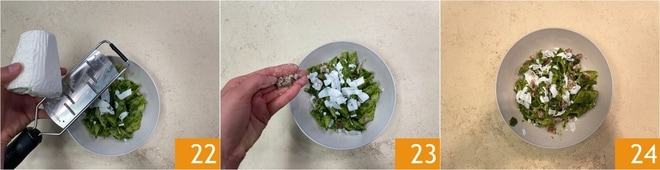 Termina con la ricotta salada 22 y unas castañas desmenuzadas 23. ¡Tus pennones están listos, disfrútalos de inmediato 24!