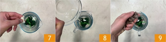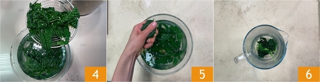 Después de aproximadamente un minuto, escúrrela con una espumadera, reservando el agua de cocción, y transfórmala a un bol con agua y hielo 4. De esta manera, enfriándola rápidamente, mantendrá un color brillante. Ahora exprímela 5 y transfiérela a un recipiente alto y estrecho 6.