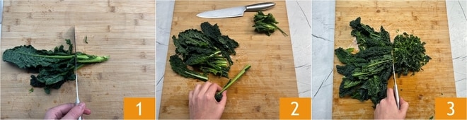 Para realizar la pasta con col rizada, empieza por limpiar la col: después de lavarla, corta la base 1 y elimina la parte más dura y coriácea del tallo 2, sin necesariamente eliminar el resto de la nervadura central si no es demasiado coriácea. Evalúa hoja por hoja para reducir el desperdicio, eliminando la nervadura solo donde no sea lo suficientemente tierna. Corta la col limpia en tiras bastante finas 3.