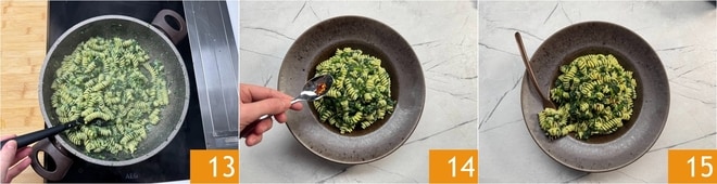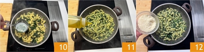 Mezcla bien y completa la cocción terminando la pasta con el agua reservada 10. Si es necesario, ajusta de sal. Finalmente, con el fuego apagado, mezcla con un chorro de aceite en crudo 11 y el pecorino rallado 12.