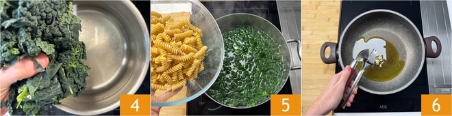 Introduce la col en una olla grande con agua hirviendo con sal 4, que ya habrás puesto al fuego para la pasta. Espera un par de minutos para que vuelva a hervir y añade también la pasta 5. Remueve y cocina 2-3 minutos menos del tiempo indicado en el paquete. Mientras tanto, en una sartén grande deja que se aromatice suavemente un chorro de aceite con un diente de ajo sin el germen y prensado 6. El fuego debe estar muy bajo para que el aceite se aromatice sin que el ajo se oscurezca.