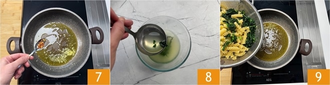 Añade el chile seco 7 y mezcla. Mientras tanto, reserva 2-3 cucharones abundantes de agua de cocción en un bol 8. Escurre la pasta con la col y transfiérela a la sartén con el sofrito 9.