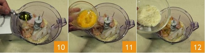 Luego vierte el aceite 10, el huevo batido 11 y el Grana Padano DOP rallado 12. Finalmente ajusta de sal y pimienta.