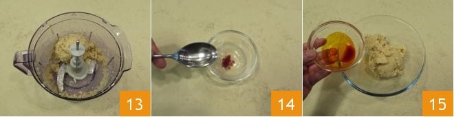 Tritura los ingredientes hasta obtener una mezcla homogénea 13. Detén las cuchillas de la batidora y trasládalo a un bol grande. Luego disuelve el azafrán en un cuenco pequeño con un poco de agua caliente (la misma que tienes lista para cocinar la pasta irá bien) 14: agrégalo a la mezcla obtenida 15.