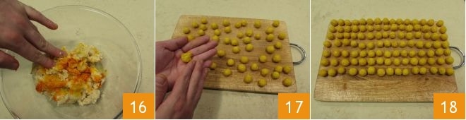 Amalgama bien los ingredientes mezclándolos enérgicamente con las manos 16. Cuando estén bien amalgamados, toma aproximadamente 6 g de la mezcla y forma albóndigas 17: obtendrás en total 105 que podrás disponer en una bandeja 18.