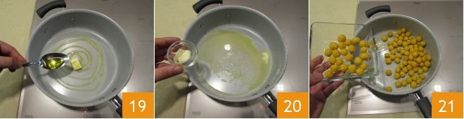En este punto, toma una sartén antiadherente de fondo ancho y vierte aceite y mantequilla 19: cuando la mantequilla se haya derretido y el aceite esté caliente, dora un diente de ajo 20. Una vez dorado, elimínalo. Vierte ahora las albóndigas 21: déjalas dorar durante 4-5 minutos a fuego alto asegurándote de que no se peguen al fondo de la sartén.