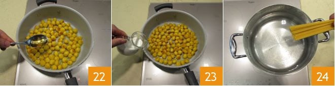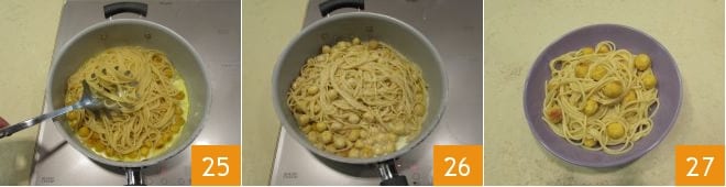 cuando estén al dente, escúrrelos directamente en la sartén con el condimento de albóndigas 25: mezcla bien la pasta con el condimento 26, bastarán unos instantes. Luego apaga el fuego y sirve tu pasta con albóndigas de pescado para disfrutarla bien caliente 27!