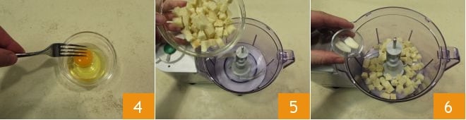 Pon a hervir agua caliente en una olla grande y cuando llegue a ebullición, sala al gusto: servirá para cocinar la pasta. Luego bate el huevo en un cuenco pequeño 4 y toma una batidora en la que viertas la miga de pan 5 y el ajo pelado, al que también le hayas quitado el germen interno 6.