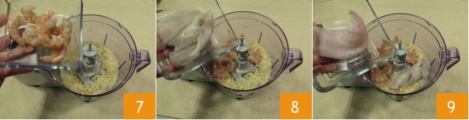 Agrega a la batidora las colas de gamba limpias 7, el filete de bacalao 8 y la platija 9. Puedes picar groseramente los pescados o ponerlos enteros: trabajándolos con la batidora las carnes tiernas se triturarán igualmente.