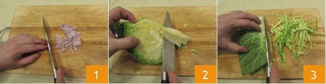 Para realizar la pasta con trucha, comenzad poniendo al fuego una cacerola con abundante agua y sal cuando hierva. Mientras tanto, preparad todos los ingredientes que necesitaréis: limpiad y picad finamente el chalote 1, luego lavad y secad la col, eliminad las hojas más externas y la costilla central 2 y cortad la parte restante en tiras 3.