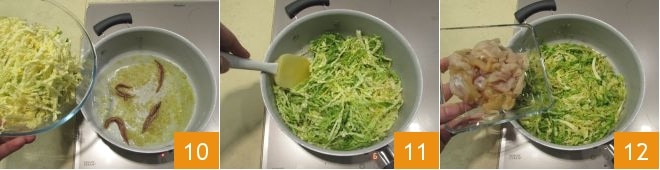y la col cortada en tiras 10, salpimentad al gusto y cocinad a fuego vivo durante unos 10 minutos, removiendo de vez en cuando 11. Ahora añadid los trozos de trucha en la sartén 12, mezclad