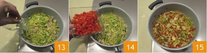 y desglasad con el vino blanco 13, dejándolo evaporar completamente. Por último, añadid los tomates en cubitos 14, ajustad de sal y pimienta y cocinad durante 5-6 minutos removiendo de vez en cuando, después apagad el fuego 15.