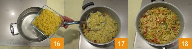 Mientras tanto, poned a cocer las farfalle en la cacerola con agua hirviendo salada al gusto 16. Escurrid la pasta al dente y vertedla en la sartén junto con el condimento 17, mezclad para amalgamar todo 18 y ¡servid vuestra pasta con trucha bien caliente!