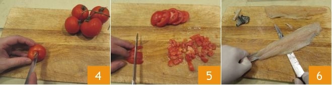 Lavad los tomates, eliminad la parte verde del tallo 4 y cortadlos primero en rodajas y luego en cubitos 5. Finalmente, tomad los filetes de trucha: quitad la piel deslizando suavemente el cuchillo a ras de la piel, comenzando desde la cola hasta la cabeza 6, y palpád la carne con los dedos para verificar que no haya espinas: si las hay, podéis retirarlas con unas pinzas de cocina.