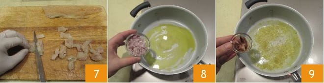 Cortad los filetes de trucha en trozos 7. Calentad una sartén con el aceite de oliva virgen extra, añadid el chalote picado 8 y dejadlo pochar a fuego lento durante unos 5 minutos; cuando el chalote esté casi transparente, añadid las anchoas escurridas del aceite de conservación 9