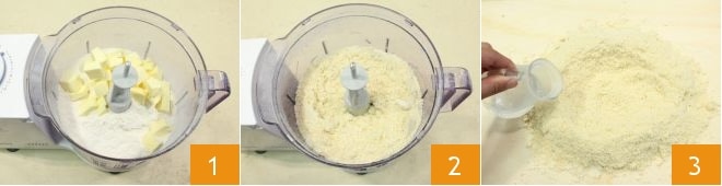 Para preparar la fish pie comienza por la masa brisa: coloca en la batidora la harina, la mantequilla fría en trozos del frigorífico 1, una pizca de sal y bate todo hasta obtener una mezcla con aspecto arenoso y harinoso 2. En este punto, dispone la mezcla obtenida sobre una superficie de trabajo en la clásica forma de fuente e amasa rápidamente añadiendo poco a poco el agua fría 3 hasta obtener una masa compacta, firme y bastante elástica.