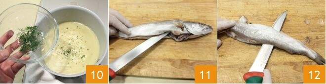 finalmente añade el eneldo, el tomillo y la pimienta 10. Reserva la bechamel y ocúpate de limpiar la merluza: haz un corte en el vientre y procede recto hasta debajo de la cabeza 11, luego recoge con las manos las vísceras y elimínalas. Lava bien el vientre del pescado bajo agua corriente para eliminar cualquier rastro de sangre restante. Corta las aletas con tijeras adecuadas, con el cuchillo fileta pescado haz una incisión en la cabeza y elimínala, luego haz una incisión en la parte dorsal del pescado a lo largo de la columna vertebral 12, comenzando desde arriba, y procede moviendo la cuchilla horizontalmente respecto al plano de trabajo,