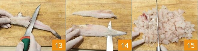 para separar los dos filetes 13. Finalmente, separa la carne de la piel 14. Elimina las posibles espinas con pinzas de cocina, luego pica groseramente la merluza 15.