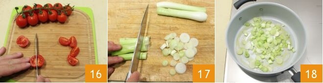 lava y corta en cuartos los tomatitos 16, lava y corta en rodajas el cebollino 17 transfiérelo a una sartén con un poco de aceite 18 y déjalo rehogar a fuego moderado