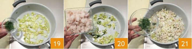 añade el eneldo y el tomillo 19 y luego incorpora la merluza picada 20, cocina durante 2 minutos luego aromatiza el pescado con tomillo y eneldo 21,