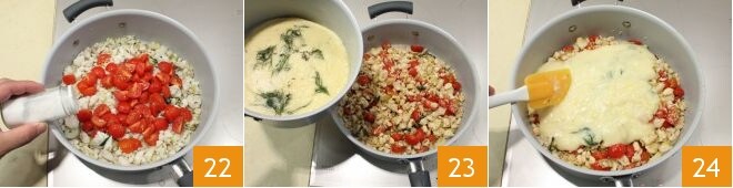 añade también los tomatitos en cuartos 22, sala, pimenta y continúa la cocción durante otros 6 minutos, luego apaga el fuego e incorpora la salsa 23 mezcla con la espátula para amalgamarla 24