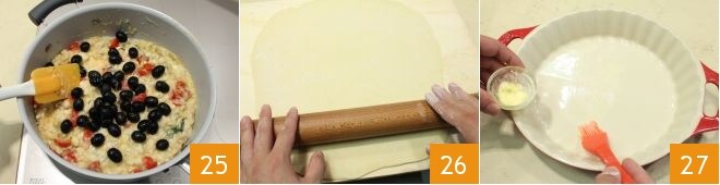 y luego añade también las aceitunas negras 25. Retoma el bloque de masa brisa divídelo en dos partes iguales (reserva la mitad de la masa envolviéndola con el film), extiende la otra mitad con el rodillo en una lámina redonda de 2-3 mm de espesor y aproximadamente 30 cm de ancho 26, enharina ligeramente la superficie de trabajo para evitar que la lámina se pegue. Unta con mantequilla un molde para horno con borde ondulado de 27 cm de diámetro 27.