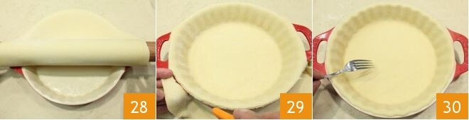 Enrolla la lámina en el rodillo y luego desenróllala sobre el molde 28, haz que la masa se adhiera al fondo y a los bordes con una ligera presión de las manos, recorta la masa sobrante a lo largo de todo el perímetro del molde 29, pincha el fondo con los dientes de un tenedor 30