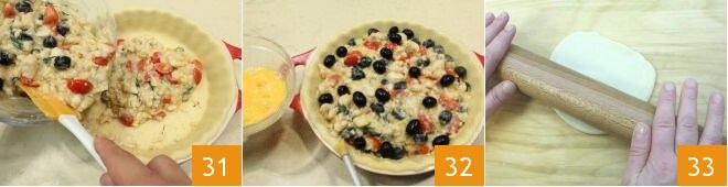 vierte el relleno de merluza en el molde 31 y unta los bordes de la masa con el huevo batido 32, extiende la masa restante en otra lámina igual a la primera 33,