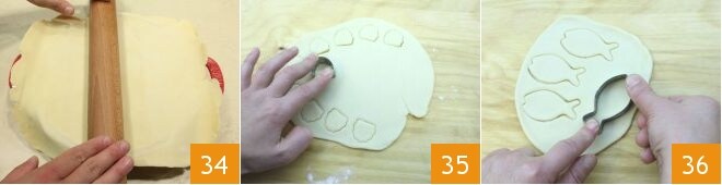 enróllela en el rodillo y extiéndala sobre el molde, presiona los bordes con el rodillo para hacer que la lámina se adhiera y eliminar la masa sobrante 34. Con la masa sobrante haz formas con cortadores de galletas, nosotros elegimos conchas 35 y pececitos 36,