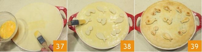 luego unta sobre la superficie del pastel el huevo batido con la leche 37 y haz que las formas de masa se adhieran. Unta también estas últimas con el huevo batido 38. Hornea la fish pie en horno precalentado estático a 180° durante 45 minutos, luego a 170° durante otros 20 minutos (si el horno es con ventilador a 160° durante 35 minutos y luego a 150° durante 10 minutos). Saca la fish pie del horno y deja que se temple antes de servirla 39.