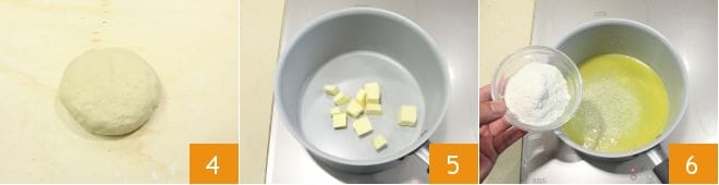 Una vez lista, dale forma de un bloque 4 y envuélvelo con un papel film de cocina y déjalo reposar en el frigorífico durante al menos 40 minutos. Mientras tanto, coloca la mantequilla en trozos en un cazo 5, déjala derretir y añade la harina 6,