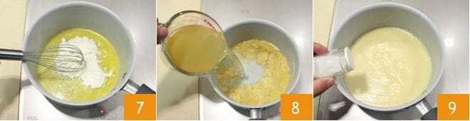 dilúyela con un batidor 7 y luego vierte el caldo de pescado 8, cocina hasta que espese a fuego lento, sala 9