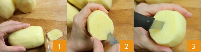 Para preparar las patatas rellenas de la abuela Franca, comenzad pelando las patatas. Luego cortad ambos extremos 1, de modo que las patatas se mantengan de pie por sí solas. Después coged un cuchillo pequeño, haced un corte a lo largo del perímetro interno de las patatas, dejando un borde de 3-4 milímetros 2 y realizad un corte también en el centro de la pulpa 3, para facilitar su extracción.