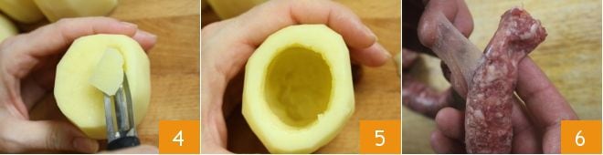 Siempre con un cuchillo pequeño, un vaciador o un pelador de verduras extraed la pulpa interna 4 sin perforar el fondo 5. Una vez vaciadas todas las patatas, colocadlas en un bol y cubridlas con agua, de este modo no se oscurecerán. Ahora dedicáos a la preparación de los ingredientes del ragú: haced un corte en la salchicha y desmenuzadla en un bol pequeño 6.